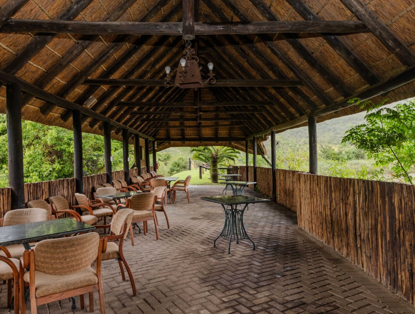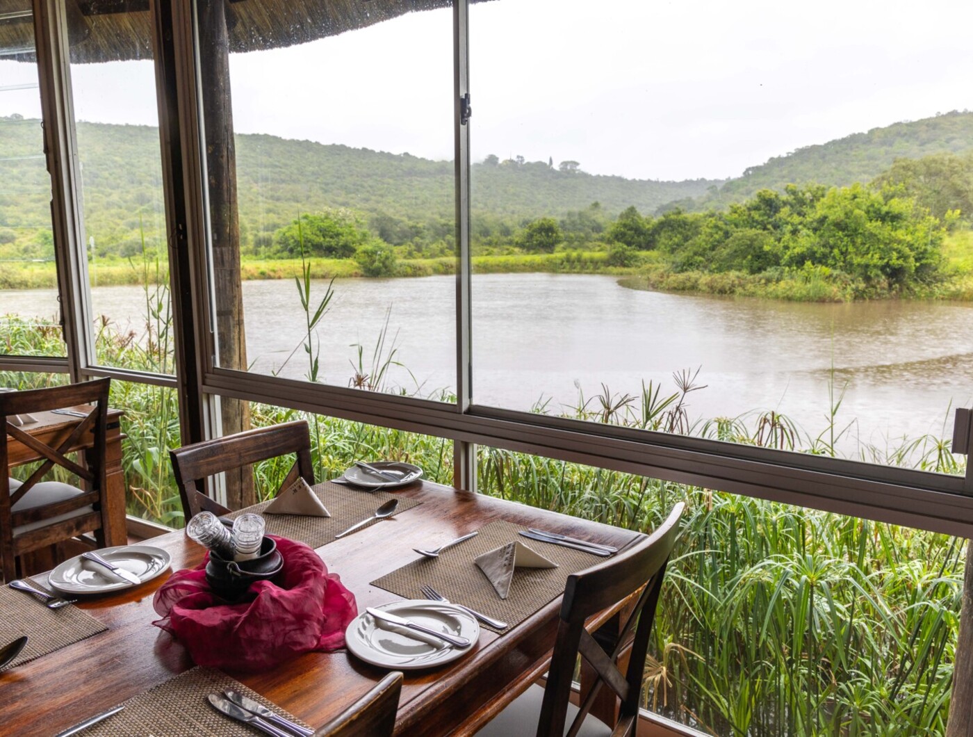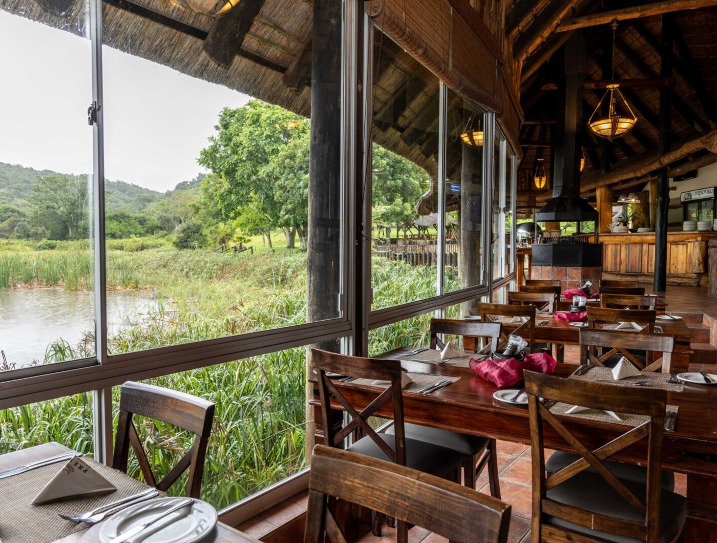 Guests can enjoy their meal while watching animals gather by the nearby water. The décor subtly incorporates Xhosa elements, and the proximity to wildlife adds a unique touch to the experience.